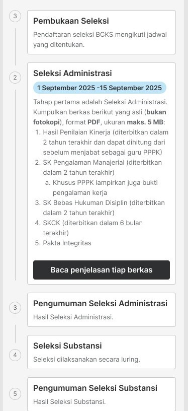 2. Pada halaman Seleksi/Pelatihan BCKS, Anda akan menerima pengumuman dari Dinas Pendidikan mengenai pembukaan pendaftaran Seleksi/Pelatihan BCKS. Anda juga dapat melihat informasi mengenai persyaratan Bakal Calon Kepala Sekolah.