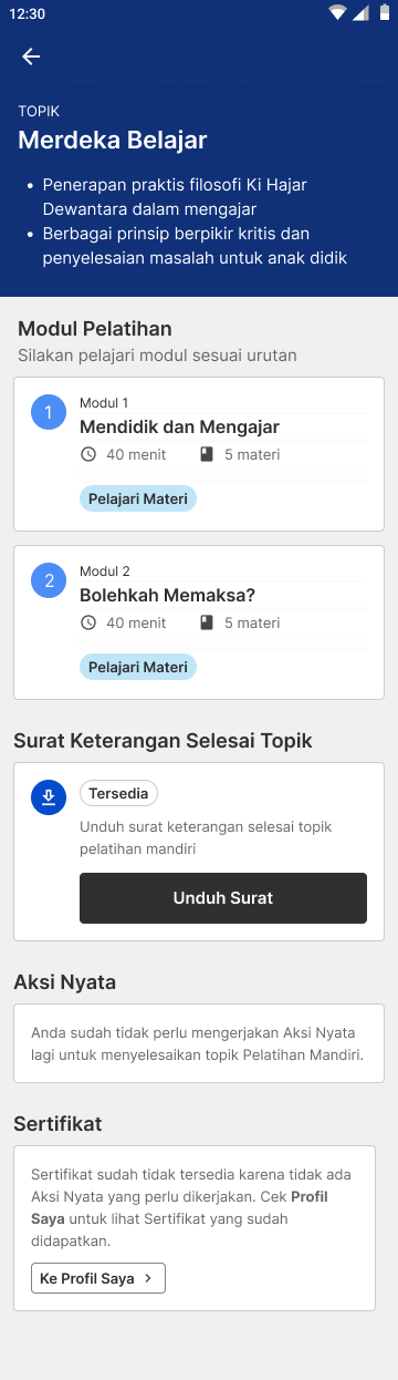 Setelah menyelesaikan topik, Anda dapat mengunduh Surat Keterangan Selesai Topik dengan klik ‘Unduh Surat’. Untuk cara mengunduh surat keterangan topik, silakan klik di sini.