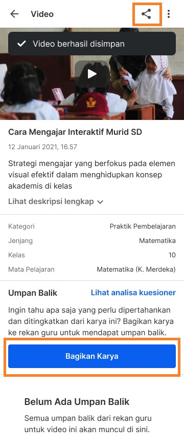 Umpan balik adalah tanggapan atau saran dari rekan guru dan kepala sekolah terhadap karya yang disimpan ke Bukti Karya. Semua guru dan kepala sekolah yang memiliki akses ke Ruang GTK dapat memberikan umpan balik. Dengan memberikan umpan balik, Anda tidak hanya bisa saling belajar dari sesama rekan guru ataupun kepala sekolah, tetapi juga bisa membantu mereka terus bertumbuh.