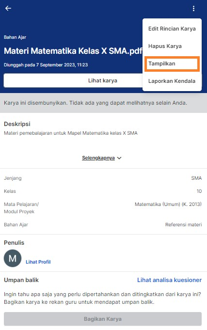 Perlu diketahui, Anda bisa menyembunyikan karya agar orang lain tidak bisa mengakses karya Anda. Panduan di bawah ini bisa diterapkan untuk dua bentuk karya, video maupun dokumen (PDF).