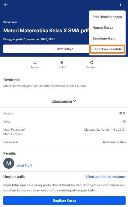 1. Pada halaman detail karya, klik tanda titik tiga pada halaman detail karya Anda, lalu pilih Laporkan Kendala