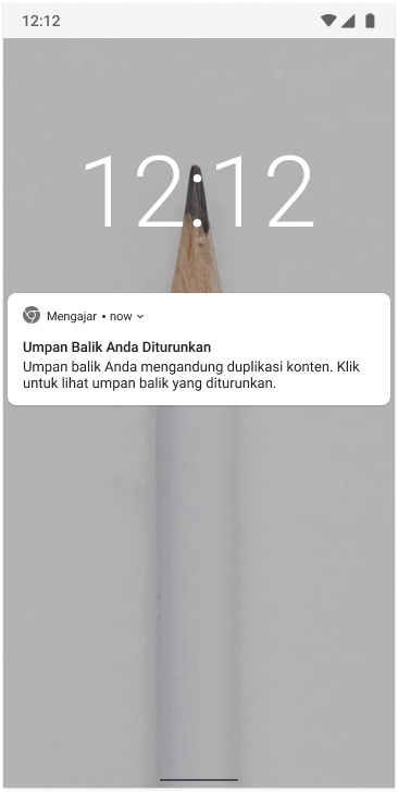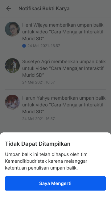 Jika Anda menerima umpan balik yang tidak sopan, mengandung SARA, atau melanggar ketentuan lainnya dan telah melaporkan umpan balik tersebut, maka setelah dilakukan investigasi, umpan balik tersebut akan diturunkan (takedown) oleh Tim Kemendikdasmen karena melanggar ketentuan penulisan umpan balik. Berikut pemberitahuan umpan balik yang telah diturunkan.